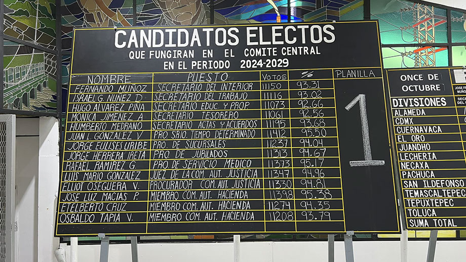 Con 11,949 votos emitidos, concluyó el proceso electoral 2024 - 2029 para elegir medio Comité Central. Desde el Lunes 17 hasta el Jueves 27 de Junio del 2024, se abrieron las casillas en las doce Divisiones que integran nuestro glorioso Sindicato, con la observación de las autoridades correspondientes y de diferentes organizaciones. Posteriormente se llevó a cabo el arduo conteo de los votos que concluyó con el anuncio de la planilla ganadora, la Planilla Once de Octubre. Así mismo, el resultado del conteo de votos se registró en los pizarrones dedicados a ello y se expusieron en el lobby del Edificio Sindical de Antonio Caso 45, así, el resultado electoral quedó a la vista de todos.