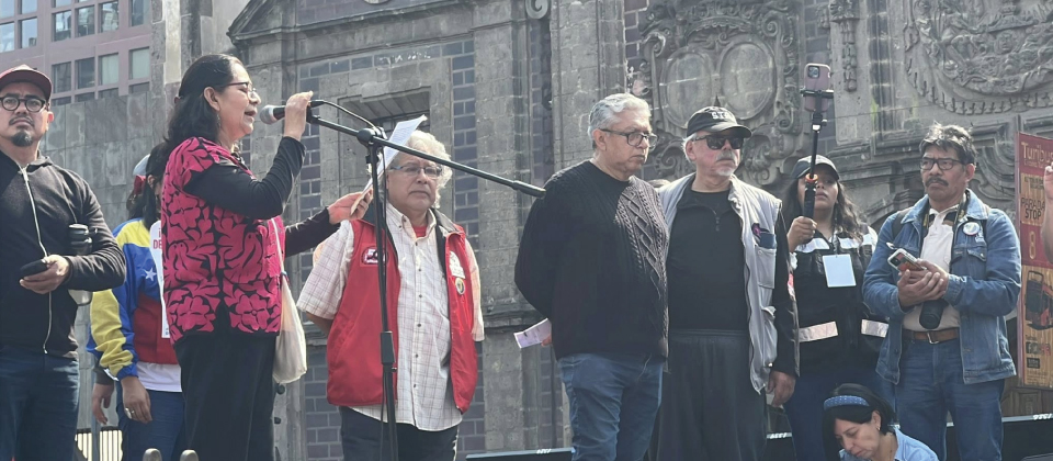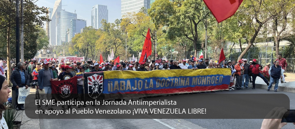 Junto con numerosas organizaciones sindicales y sociales, el SME marchó desde el Ángel de la Independencia con dirección a la Alameda Central, lugar donde se llevó a cabo un mitin en el que en primera instancia escuchamos el posicionamiento central de la movilización llamando a liberar al Presidente en funciones, Nicolás Maduro y a su esposa, la diputada Cilia Flores, quienes fueran secuestrados por el gobierno del trístemente célebre Donald Trump el pasado 3 de enero por la madrugada.