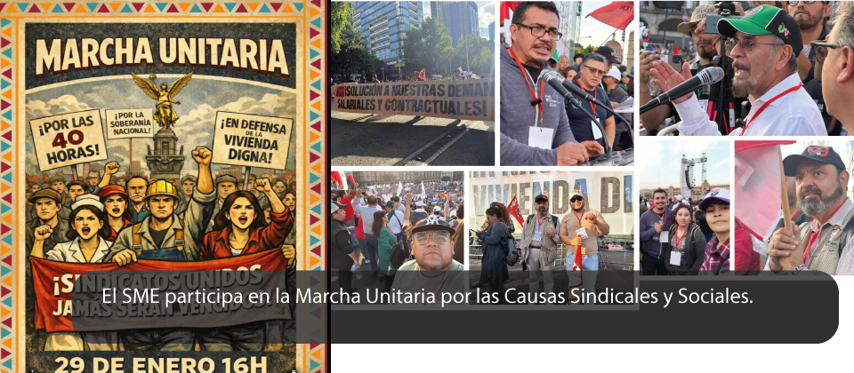 Tal es el caso del Sindicato Mexicano de Electricistas que tras 16 años de lucha incansable, clama hoy por Solución a sus justas demandas, reinserción laboral y seguro social. Todo esto en voz de nuestro compañero Secretario de Sucursales, Eulises Uribe Gaona, quien en su discrurso, se pronunció por la solución a conflictos de otras organizaciones, apoyo al Pueblo Palestino y al Pueblo Venezolano. El SME, miembro de la Nueva Central de las y los Trabajadores, estuvo presente con una comisión participativa.