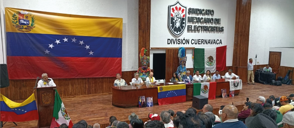 En la División Cuernavaca del Glorioso Sindicato Mexicano de Electricistas, se llevó a cabo este sábado, el encuentro por la Soberanía y Autodeterminación del Pueblo y Gobierno de Venezuela, en el que junto con organizaciones civiles, sindicales y colectivos sociales, llamaron a la conformación del Frente Estatal Antiimperialista en Defensa de la Soberanía y la Autodeterminación de los Pueblos, esto con la presencia de la invitada especial, Stella Marina Lugo de Montilla, Embajadora de Venezuela en México.